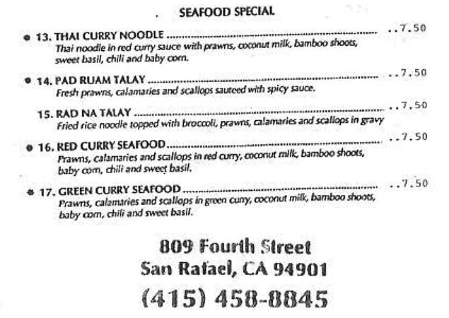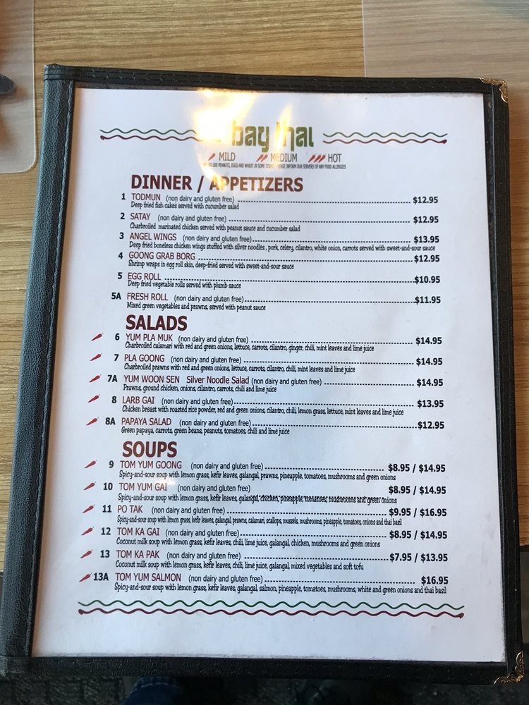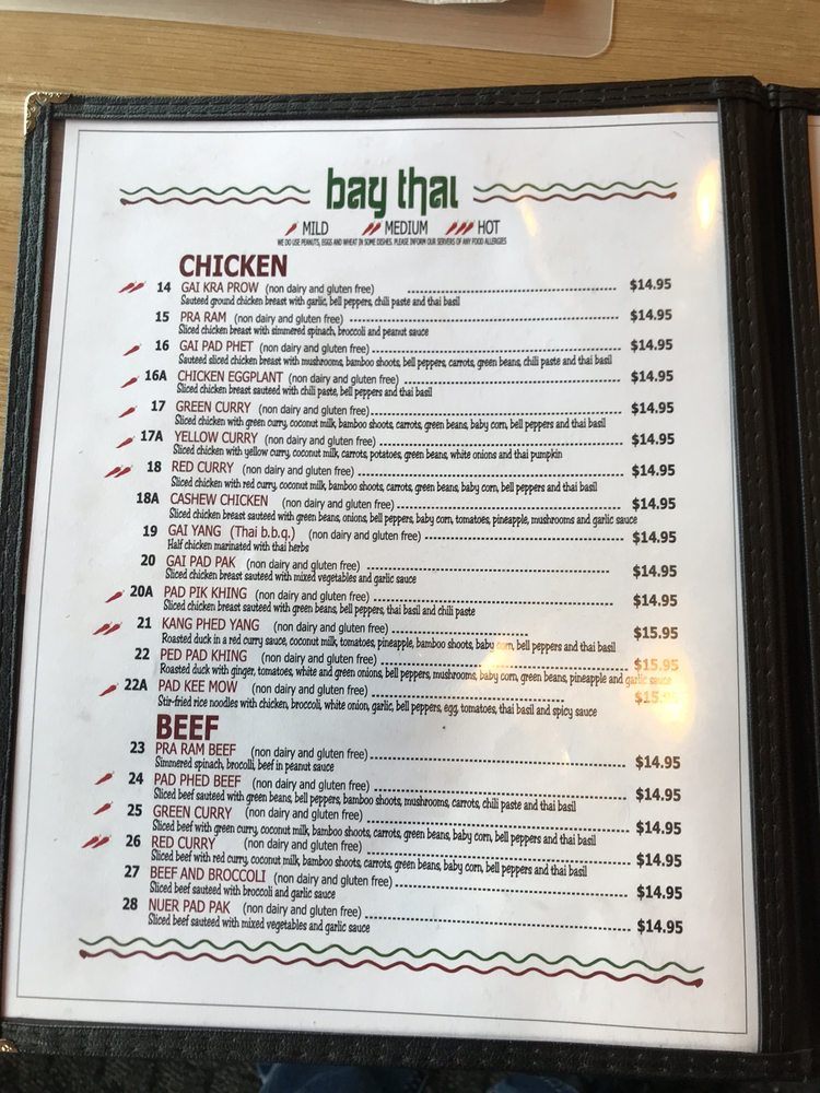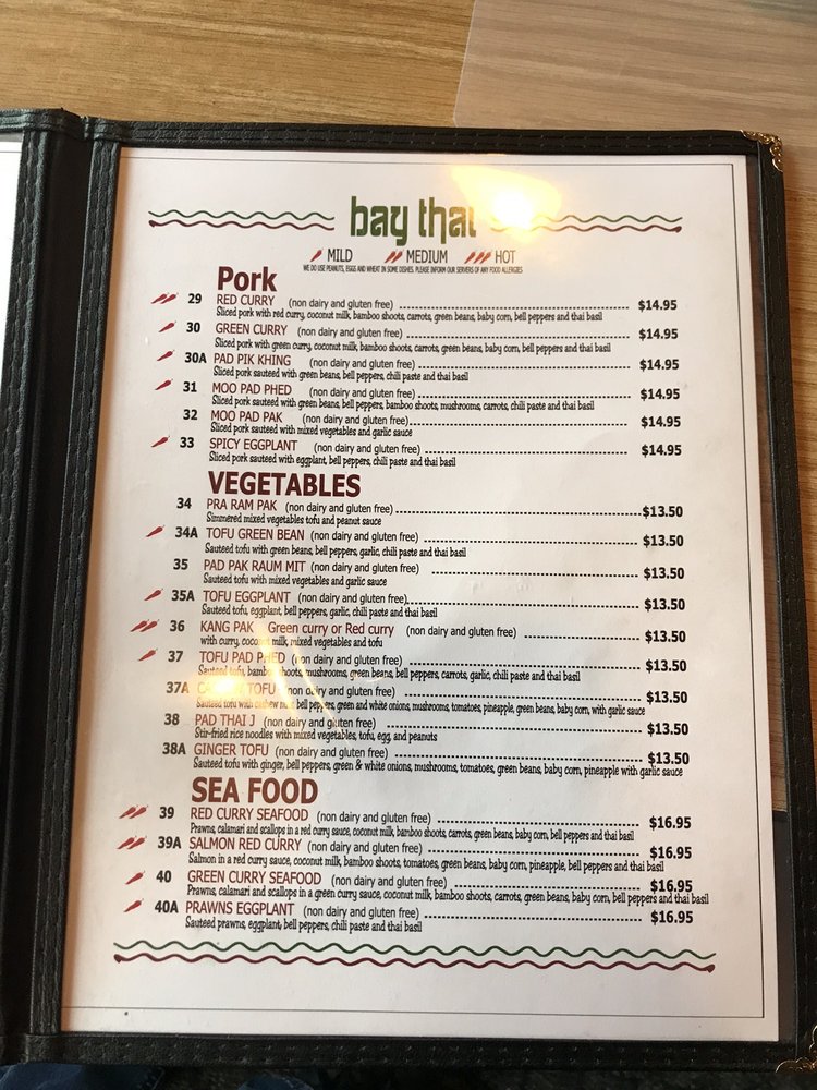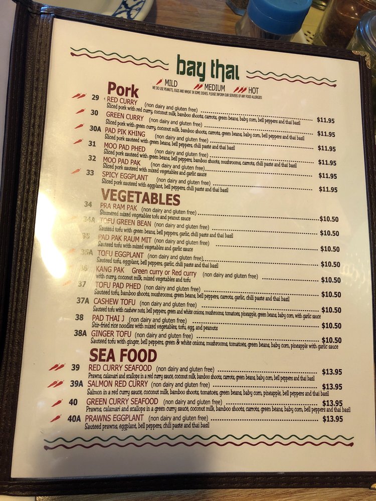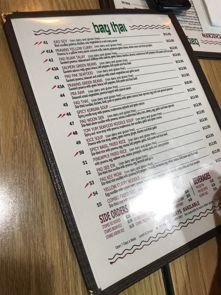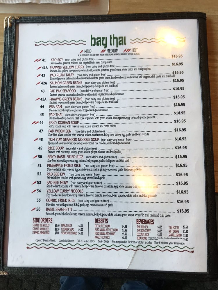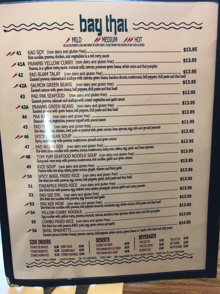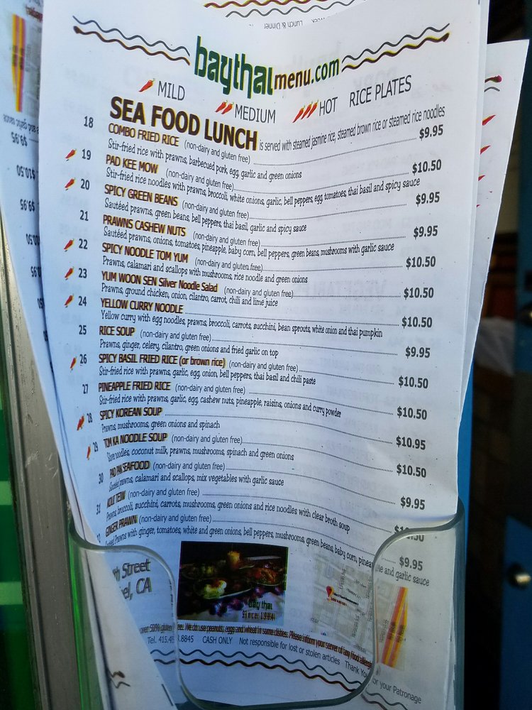 Introducing the menu at Bay Thai Cuisine, a hidden gem offering authentic Thai flavors in San Rafael, CA. With a diverse menu including curry, Pad Se Ew, Drunken Noodles, and the famous Pad Thai, this spot is a favorite for affordable Thai delights. Customers rave about the Tom Ka soup and generous portions, making it a must-visit for Thai food enthusiasts. The owners and staff are praised for their hospitality, creating a welcoming atmosphere for guests. While some dishes like the pad Thai may be hit or miss, the overall experience at Bay Thai Cuisine is one of flavorful dishes served with soul. With options for vegetarians and a range of payment methods accepted, this casual yet classy restaurant is perfect for lunch, dinner, or catering for groups. Don't forget to try their Thai basil fried rice, chicken satay, and mango sticky rice for a complete Thai culinary experience.